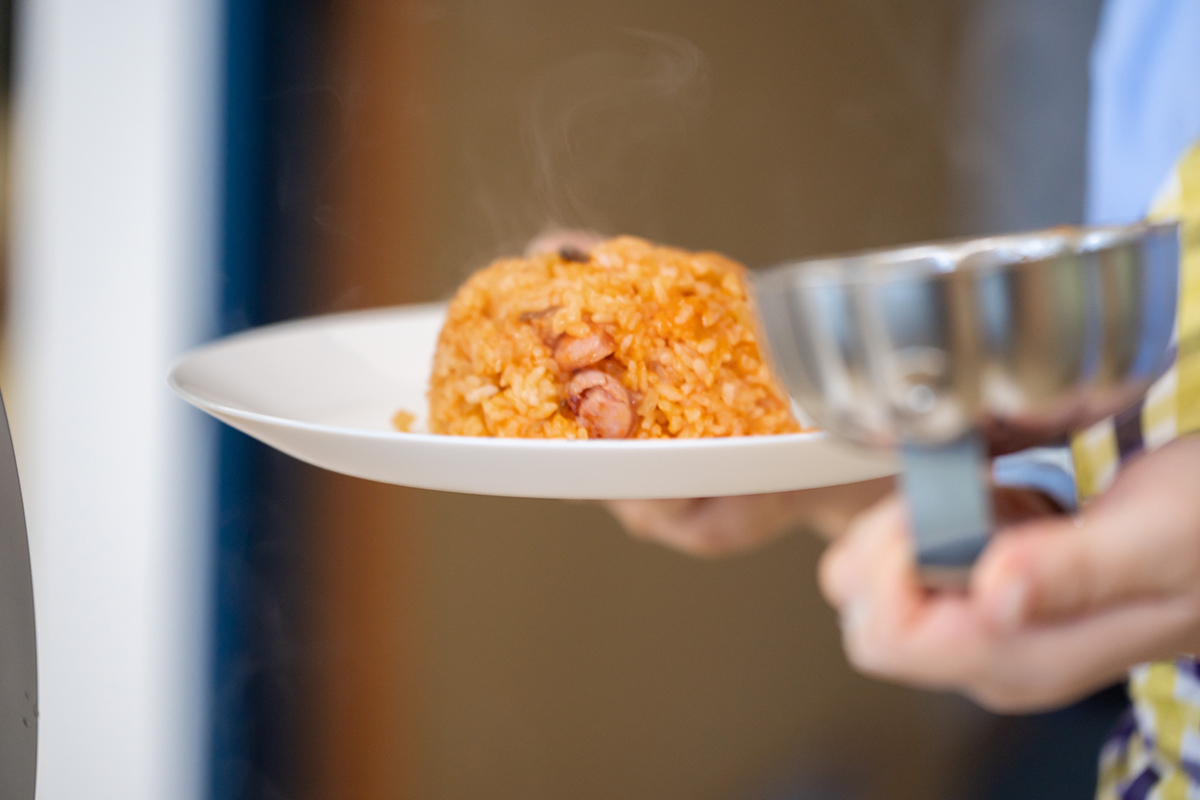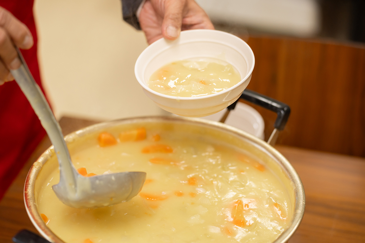 配膳が始まると「美味しいにおいがする」と女性社員が集まってきました。ピリ辛のスープは食欲増進効果が抜群でした。今月の調理担当は企画生産部で主にデザインを担当している高橋さんでした。