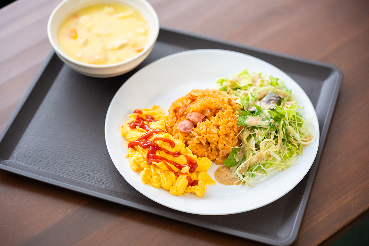 11月の社食は、ウインナーライス+スクランブルエッグ、クリームシチュー、生野菜を用意しました。野菜をたくさん食べられる献立にしました。