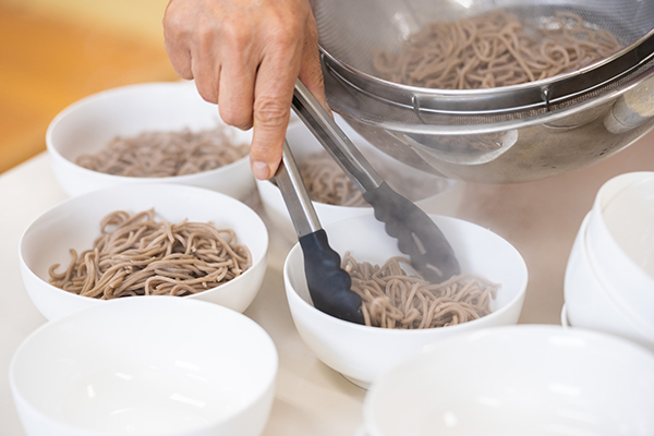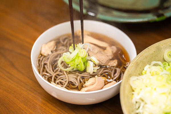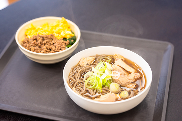 3月の社食は、繁忙期メニューのかしわ蕎麦とミニ三色丼を用意しました。繁忙期は残業や体を動かすことがとても多くなるので、炭水化物とタンパク質がたくさん摂れる献立にしました。かしわ蕎麦の鶏肉は一人100gにしたので、とてもボリューミーになりました。