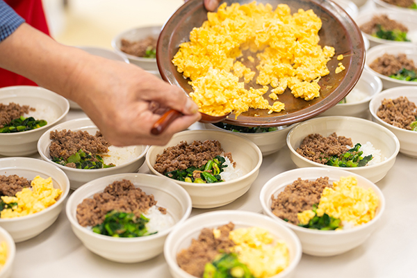 ミニ三色丼には、みそ味の肉そぼろ、小松菜のおかか和え、そして炒り卵をのせました。