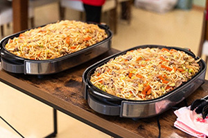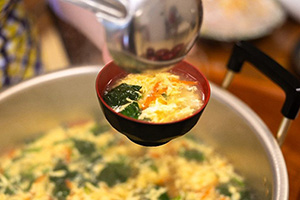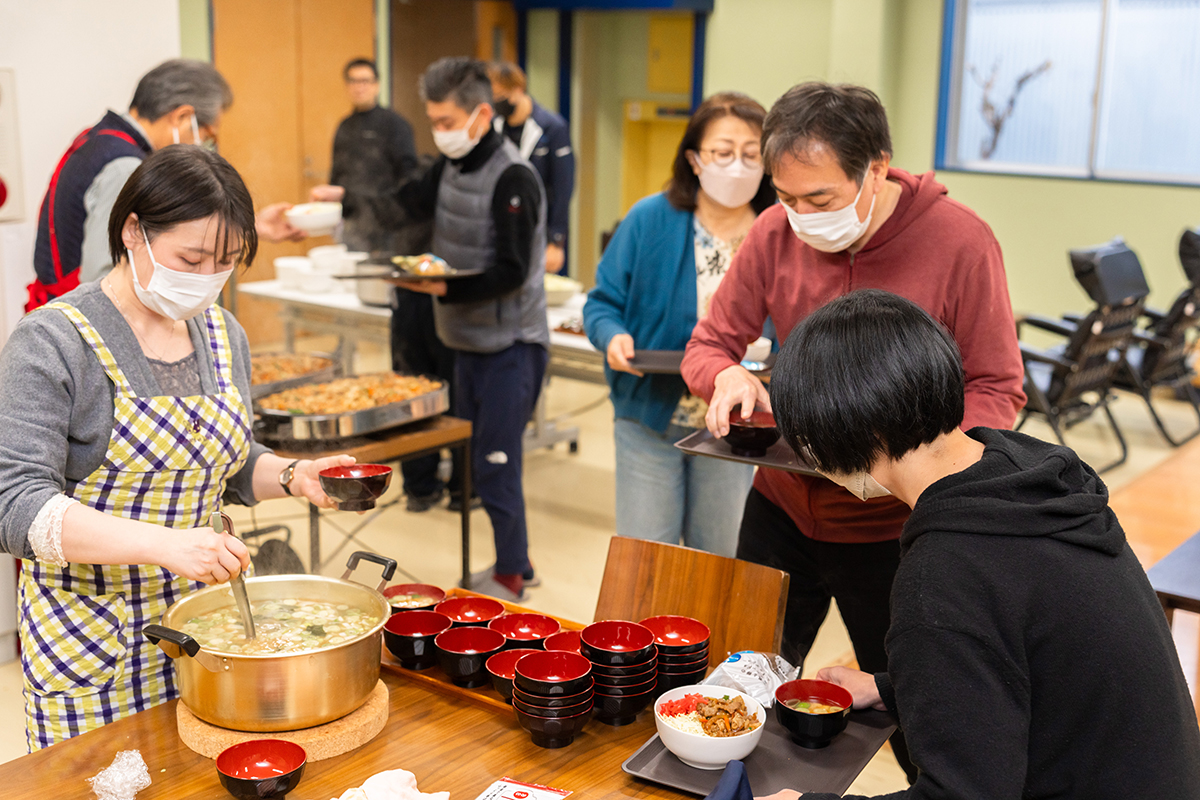 配膳が始まると「美味しいにおいがする」と女性社員が集まってきました。ピリ辛のスープは食欲増進効果が抜群でした。今月の調理担当は企画生産部で主にデザインを担当している高橋さんでした。