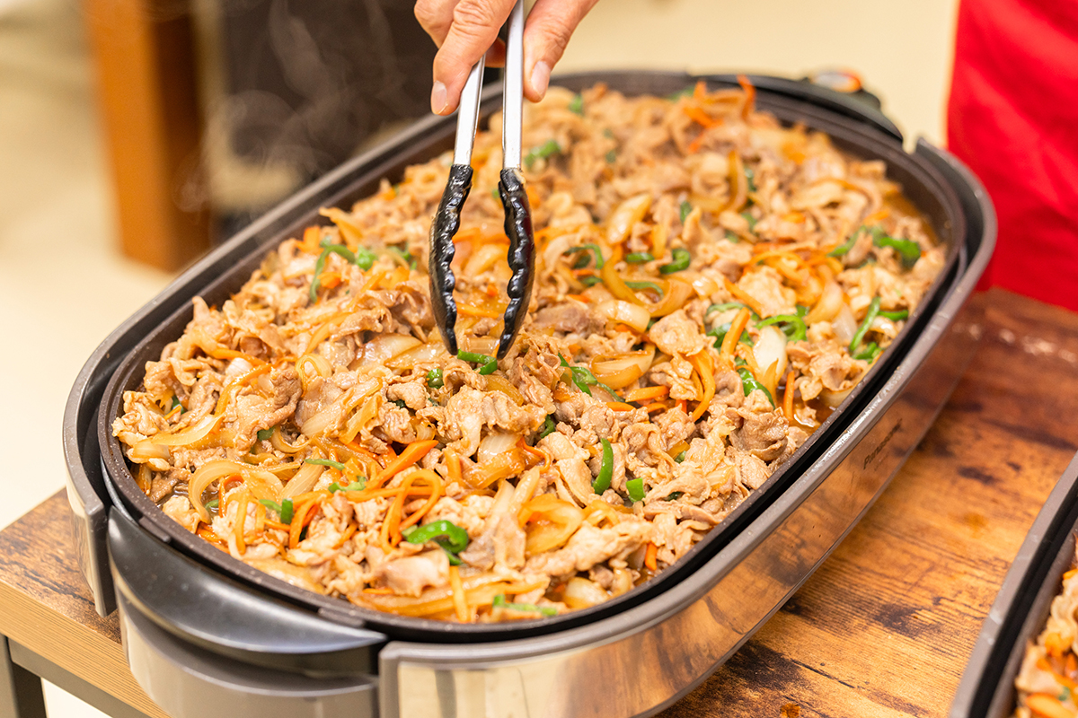 プルコギ丼は人参、玉ねぎ、ピーマン、味付けした肉をそれぞれ炒めた後に、ホットプレートで軽く混ぜ白ごまを入れて仕上げました。白ご飯に千切りキャベツをのせ、その上、にプルコギをのせるスタイルで提供しました。個々の好みにあわせてカスタマイズできるように、紅ショウガ、七味、マヨネーズも用意しました。準備していたプルコギは全て完食となりました。