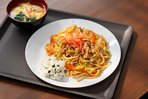 2月の社食は、初挑戦の醬油味の焼うどん、わかめごはん、ほうれん草のかきたま汁を用意しました。春キャベツを美味しく食べてもらいたいと思い考えた献立です。春キャベツの他にも人参、玉ねぎ、もやし、豚肉を入れ、たくさんの野菜が摂れるようにしました。「かきたま汁に入っていたじゃがいもが美味しかった」との感想もいただきました。