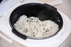 繁忙期を迎えていることもあり忙しく動きまわっている社員が多いので、希望者にはわかめごはんが食べられるように用意しました。