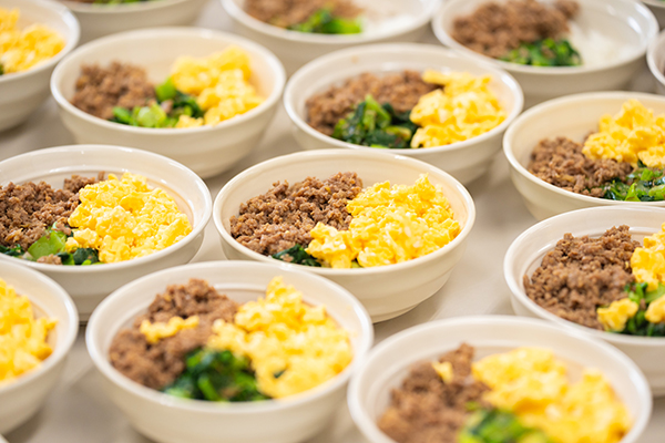 ミニ三色丼には、みそ味の肉そぼろ、小松菜のおかか和え、そして炒り卵をのせました。